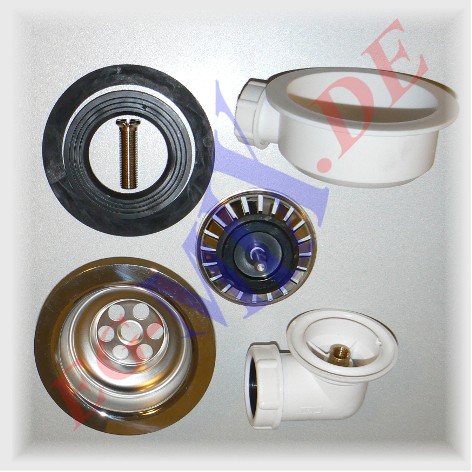 Korbventil 3 1/2" mit Anschluß für Überlauf besteht aus: - Winkelstück für Ablaufgarniturmit Handbetätigung (Schraubverbindung) Abgang seitlich 90° / 1 1/2" - Unterteil für Ventilkelch mit Anschluß für Überlauf 25 mm - Ventilkelch Chromnickelstahl 18/10 ø 114 mm - Siebkörbchen für Handbetätigung - Hohlschraube 35 mm - Dichtungen