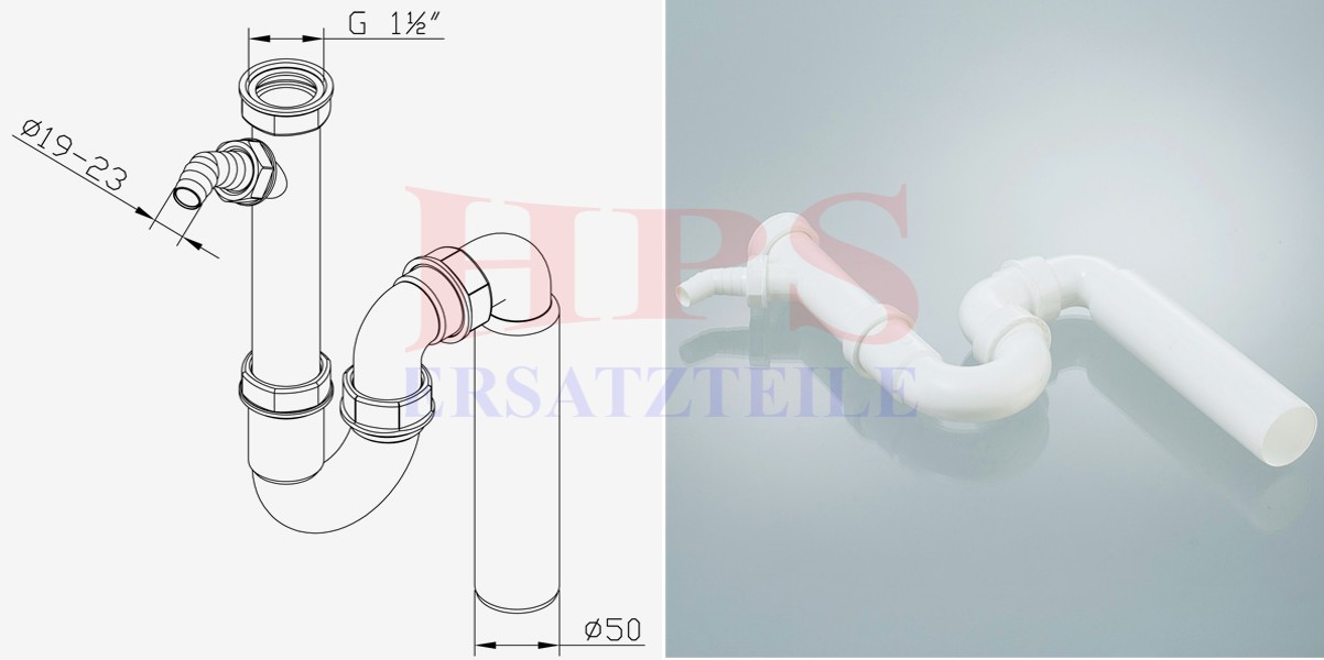 HPS-Universal-Röhren-Geruchverschluss 1 1/2” x 50 mm mit Anschluss für den Ablaufschlauch einer Wasch- oder Geschirrspülmaschine, mit Winkel- Schlauchverschraubung. Geeignet für alle Ablaufgarnituren.